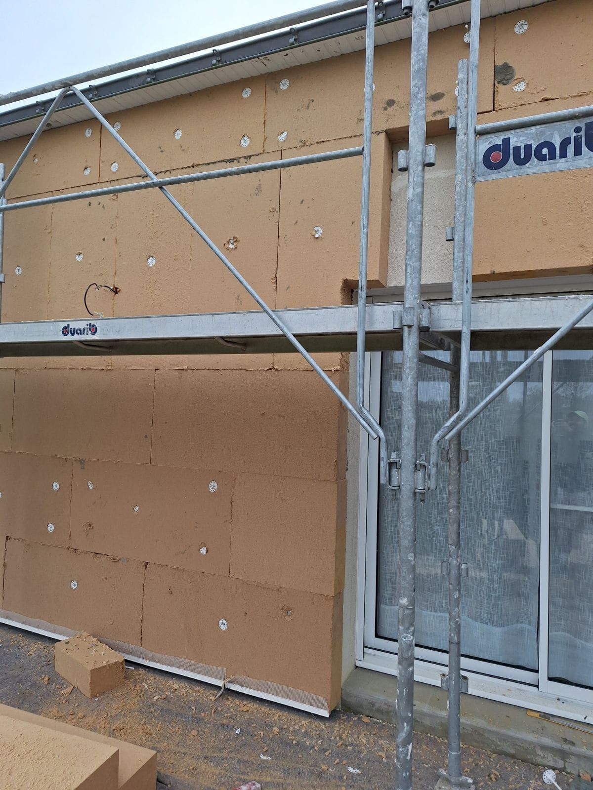 L'isolant sélectionné, nous le fixons à l'aide de chevilles, plaçons de la mousse polyuréthanne entre les joints et ponçons le tout. Des baguettes d'angle sont ensuite installées. Nous appliquons une première couche de mortier sous enduit, puis une toile en armature par-dessus. Une seconde couche d'enduit est ajoutée.